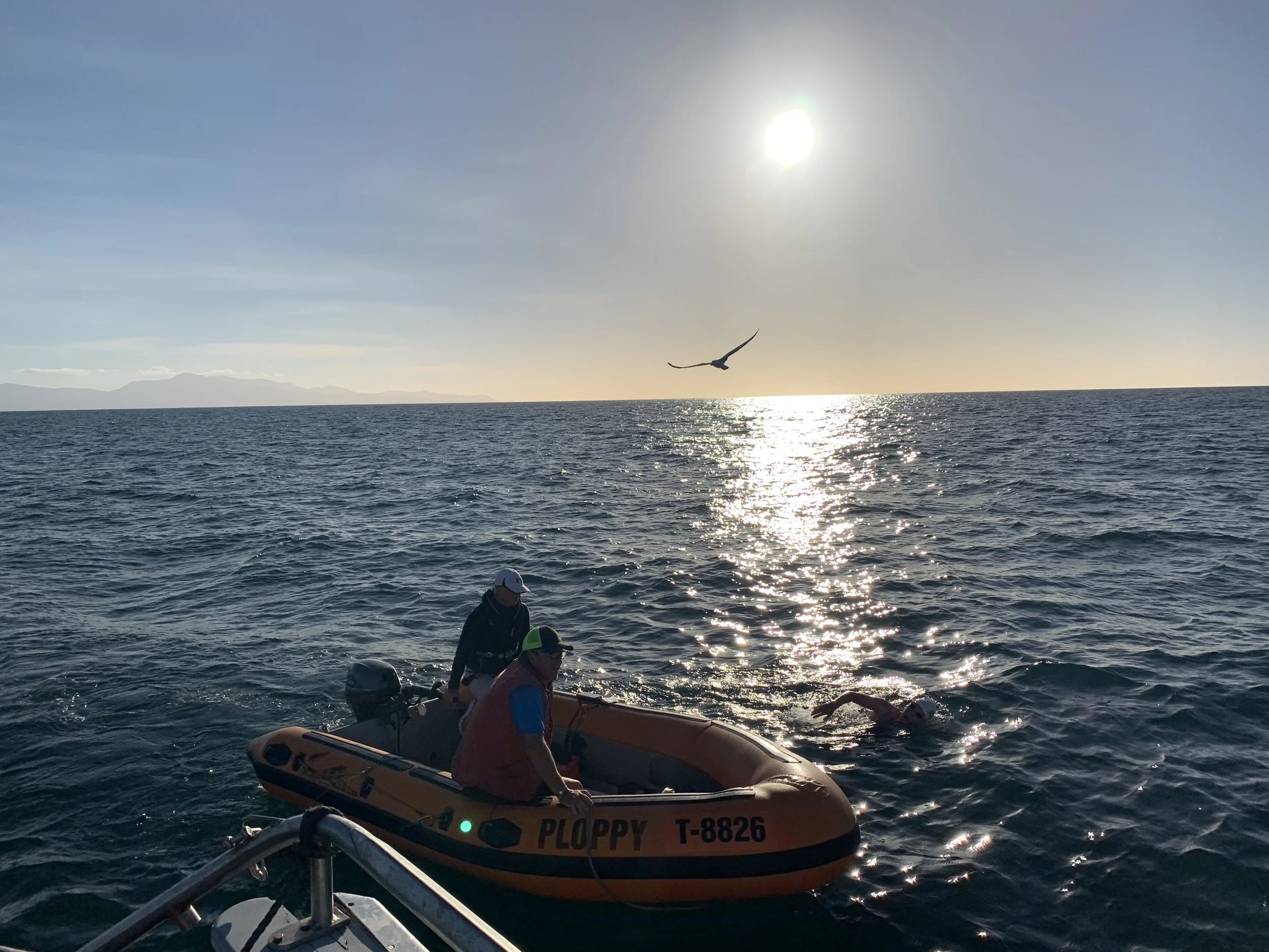 An excellent swim through the night .. & a fantastic pod of dolphins greeting her towards the end of her swim! Completed in a time of 8hours & 58minutes from Catalina to Long Beach.